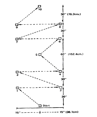 ¡@¡@¦¹´úÅç¦b´ú¶q°Ê§@«e¡B¤¤»P«áºû«ù¥¿Åªº¯à¤O¡C°ª¤¤¥Í¦Ü¤j¤H¾A¥Î¡C¦A´ú«H«×0.75¡C¥Xµo®É¥k¸}µÛ¦a¡A¤@ÅD¦Ü1¡A¥ª¸}µÛ¦a¡Aºû«ù¥¿Å³Ìªø5¬íÄÁ¡AµM«á¤SÅD¦V 2¡A¥k¸}¸¨¦a¡Aºû«ù 5¬íÄÁ¡A¦AÅD¦V3¡A¥ª¸}¸¨¦a¡Aºû«ù5¬íÄÁ¡A¦p¦¹¶i¦æ¨ì³Ì«á¤§10¡C¯à°÷ÅD¤¤¥Ø¼Ð°O¸¹±o5¤À¡A¦b¦U°O¸¹ºû«ù1¬í±o1¤À¡A¦U°O¸¹³Ì¦h±o5¤À¡A¥þ³¡¦³10Ó°O¸¹¡A¦]¦¹³Ì°ªÁ`¤À100¤À¡]¹Ï¤T¡^¡C